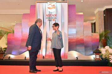 Menteri Luar Negeri Retno Marsudi (kanan) menyambut kedatangan Menteri Luar Negeri Filipina Enrique Manalo (kiri) sebelum Pertemuan ke-56 Menteri Luar Negeri ASEAN (AMM) di Jakarta, Selasa (11/7/2023). Pertemuan tersebut membahas pembangunan masyarakat ASEAN, kerjasama dengan mitra ASEAN serta mempersiapkan KTT ASEAN ke-43 pada bulan September mendatang. ANTARA FOTO/M Risyal Hidayat/hp.