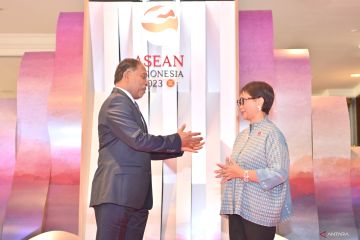 Menteri Luar Negeri Retno Marsudi (kanan) menyambut kedatangan Menteri Luar Timor Leste Bendito dos Santos Freitas (kiri) sebelum Pertemuan ke-56 Menteri Luar Negeri ASEAN (AMM) di Jakarta, Selasa (11/7/2023). Pertemuan tersebut membahas pembangunan masyarakat ASEAN, kerjasama dengan mitra ASEAN serta mempersiapkan KTT ASEAN ke-43 pada bulan September mendatang. ANTARA FOTO/M Risyal Hidayat/hp.