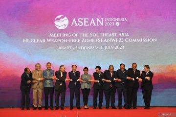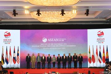 (dari kiri ke kanan) Menlu Malaysia Zambry Abdul Kadir, Menlu Filipina Enrique Manalo, Menteri Singapura Vivian Balakrishnan, Menlu Thailand Don Pramudwinai, Menlu Vietnam Bui Thanh Son, Menlu Retno Marsudi, Menlu Laos Saleumxay Kommasith, Menlu Brunei Erywan Pehin Yusof, Menlu Kamboja Prak Sokhonn, Menlu Timor Leste Bendito dos Santos Freitas, dan Sekjen ASEAN Kao Kim Hourn melakukan sesi foto jelang Pertemuan Komisi Kawasan Bebas Senjata Nuklir Asia Tenggara (SEANWFZ) di Jakarta, Selasa (11/7/2023). ANTARA FOTO/Indrianto Eko Suwarso/hp.