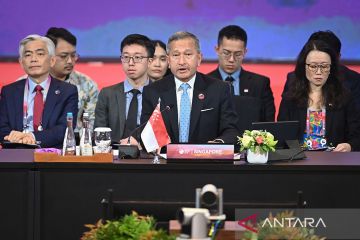 Menlu Singapura Vivian Balakrishnan (tengah) berbicara dalam Pertemuan Menteri Luar Negeri ASEAN (PMC) bersama Menlu India Subrahmanyam Jaishankar di Jakarta, Kamis (13/7/2023). ANTARA FOTO/Aditya Pradana Putra/nym.