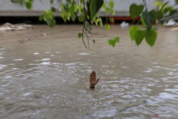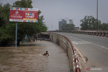 Warga berenang di jalan yang terendam banjir akibat luapan sungai Yamuna di sebuah kuil di New Delhi, India, Rabu (13/7/2023). ANTARA FOTO/REUTERS/Adnan Abidi/foc.