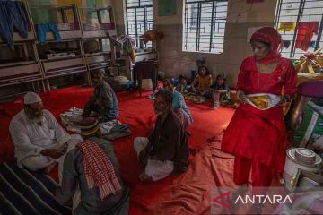 Warga terdampak banjir mengungsi di ruang kelas sebuah sekolahan yang difungsikan sebagai kamp bantuan sementara di New Delhi, India, Jumat (14/7/2023). ANTARA FOTO/REUTERS/Adnan Abidi/rwa.
