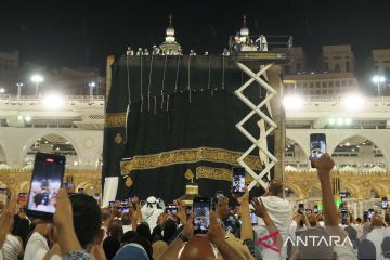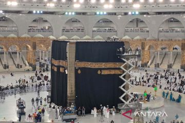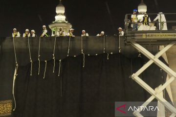 Petugas melakukan penggantian kain penutup Kabah atau kiswah di Masjidil Haram, Mekah, Arab Saudi, Rabu (19/7/2023). Pemerintah Arab Saudi mengganti kiswah setiap 1 Muharam atau masuk tahun baru Islam. ANTARA FOTO/Wahyu Putro A/aww.