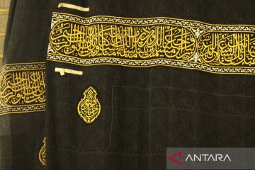 Kain penutup Kabah atau kiswah yang lama dan baru masih tertempel di Masjidil Haram, Mekah, Arab Saudi, Rabu (19/7/2023). Pemerintah Arab Saudi mengganti kiswah setiap 1 Muharam atau masuk tahun baru Islam. ANTARA FOTO/Wahyu Putro A/aww.