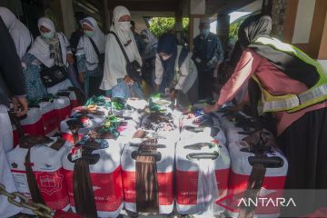 Sejumlah petugas membantu jamaah haji mencari koper saat kepulangan di Asrama Haji Donohudan, Boyolali, Jawa Tengah, Sabtu (22/7/2023). Berdasarkan data Panitia Penyelenggara Ibadah Haji (PPIH) Debarkasi Solo per (22/7) pagi, kepulangan jamaah haji sebanyak 19.353 dari 54 kloter. ANTARA FOTO/Aloysius Jarot Nugroho/aww.