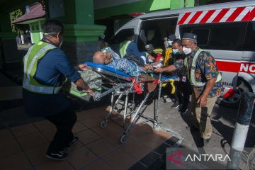 Sejumlah petugas membantu jamaah haji lansia yang sakit saat kepulangan di Asrama Haji Donohudan, Boyolali, Jawa Tengah, Sabtu (22/7/2023). Berdasarkan data Panitia Penyelenggara Ibadah Haji (PPIH) Debarkasi Solo per (22/7) pagi, kepulangan jamaah haji sebanyak 19.353 dari 54 kloter. ANTARA FOTO/Aloysius Jarot Nugroho/aww.