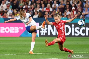 Pesepak bola putri Inggris Ella Toone (kiri) menendang bola dihadang pemain Denmark Josefine Hasbo dalam laga Grup D Piala Dunia Wanita 2023 di Sydney Football Stadium, Sydney, Australia, Jumat (28/7/2023). ANTARA FOTO/REUTERS/Carl Recine/foc.
