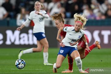Pesepak bola putri Inggris Chloe Kelly (kanan) berebut bola dengan pemain Denmark Karen Holmgaard dalam laga Grup D Piala Dunia Wanita 2023 di Sydney Football Stadium, Sydney, Australia, Jumat (28/7/2023). ANTARA FOTO/REUTERS/Jaimi Joy/foc.