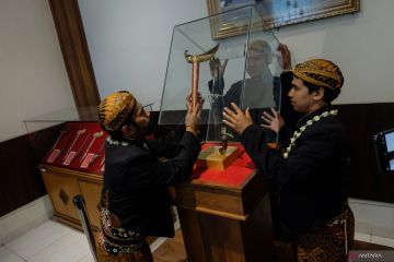 Petugas melakukan jamasan atau membersihkan pusaka keris Kyai Tengara koleksi Museum Keris Nusantara di Solo, Jawa Tengah, Sabtu (29/7/2023). Jamasan keris pemberian Presiden Joko Widodo untuk museum setempat itu digelar sebagai upaya pelestarian tradisi pada Bulan Sura dalam Kalender Jawa. ANTARAFOTO/Maulana Surya/hp.