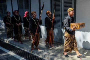 Petugas membawa pusaka keris Kyai Tengara koleksi Museum Keris Nusantara untuk jamasan di Solo, Jawa Tengah, Sabtu (29/7/2023). Jamasan keris pemberian Presiden Joko Widodo untuk museum setempat itu digelar sebagai upaya pelestarian tradisi pada Bulan Sura dalam Kalender Jawa. ANTARAFOTO/Maulana Surya/hp.
