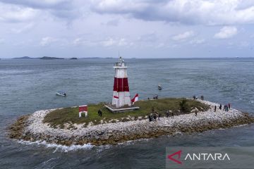 Foto udara sejumlah anggota TNI Polri bersama perwakilan sejumlah instansi membersihkan kawasan menara mercusuar perbatasan laut Batam dan Singapura di Pulau Batu Berhenti, Belakang Padang, Batam, Kepulauan Riau, Senin (31/7/2023). Pemasangan Bendera Merah Putih dan bersih-bersih kawasan menara mercusuar yang terletak di perbatasan Indonesia dan Singapura tersebut untuk menyambut HUT ke-78 Kemerdekaan RI. ANTARA FOTO/Teguh Prihatna/Spt.