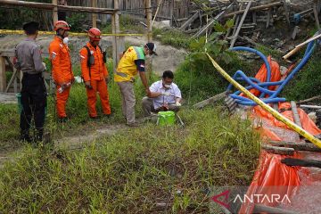Tim SAR gabungan mengambil sampel air yang dipompa keluar dari lubang tempat delapan penambang emas terjebak di Desa Pancurendang, Ajibarang, Banyumas, Jawa Tengah, Selasa (1/8/2023). Petugas mengambil sampel air untuk melakukan pemeriksaan jenis dan jumlah bakteri yang mengkontaminasi sumber air di sekitar lokasi tambang. ANTARA FOTO/Idhad Zakaria/rwa.