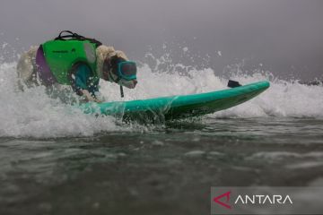 Seekor anjing bernama Faith berkompetisi pada World Dog Surfing Championships di Pacifica, California, AS (5/8/2023). ANTARA FOTO/REUTERS/Carlos Barria/tom.