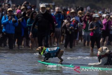 Tiga ekor anjing bernama Carson, Rosie, dan Charlie berkompetisi pada World Dog Surfing Championships di Pacifica, California, AS (5/8/2023). ANTARA FOTO/REUTERS/Carlos Barria/tom.