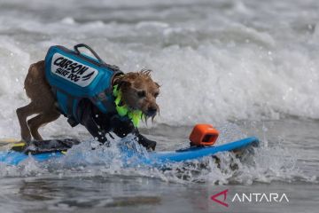 Seekor anjing bernama Carson berkompetisi pada World Dog Surfing Championships di Pacifica, California, AS (5/8/2023). ANTARA FOTO/REUTERS/Carlos Barria/tom.