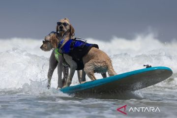 Dua ekor anjing bernama Carson dan Rosie berkompetisi pada World Dog Surfing Championships di Pacifica, California, AS,(5/8/2023). ANTARA FOTO/REUTERS/Carlos Barria/tom.