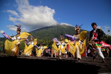Sejumlah penari menampilkan Tarian Soya-Soya Sisi pada pembukaan Gebyar Ekonomi Kreatif (GeKraf) 2023 di Pantai Tolire Ici, Kota Ternate, Maluku Utara, Minggu (8/6/2023). Kegiatan GeKraf 2023 yang diselenggarakan oleh Universitas Gadjah Mada (UGM) melalui program Kuliah Kerja Nyata (KKNPPM) bekerja sama dengan Pemerintah daerah tersebut bertujuan untuk mempromosikan pariwisata dan kebudayaan di Kota Ternate guna menarik kunjungan wisatawan serta mendongkrak perekonomian masyarakat setempat. ANTARA FOTO/Andri Saputra/pras.