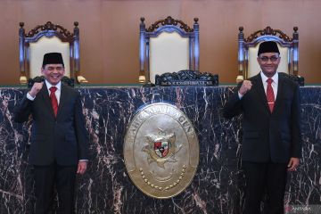 Agusman (kedua kanan) dan Hasan Fawzi (kanan) mengucapkan sumpah jabatan sebagai anggota Dewan Komisioner Otoritas Jasa Keuangan (OJK) di Gedung Mahkamah Agung (MA), Jakarta, Rabu (9/8/2023). Selain sebagai anggota Dewan Komisioner OJK, Agusman juga dilantik sebagai Kepala Eksekutif Pengawas Lembaga Pembiayaan, Perusahaan Modal Ventura, Lembaga Keuangan Mikro dan Lembaga Jasa Keuangan Lainnya, sementara Hasan Fawzi dilantik sebagai Kepala Eksekutif Pengawas Inovasi Teknologi Sektor Keuangan, Aset Keuangan Digital dan Aset Kripto. ANTARA FOTO/Aditya Pradana Putra/hp.