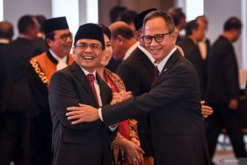 Ketua Dewan Komisioner Otoritas Jasa Keuangan (OJK) Mahendra Siregar (kanan) menyalami anggota Dewan Komisioner Otoritas Jasa Keuangan (OJK) Agusman (kiri) usai upacara pelantikan di depan para jurnalis foto di Gedung Mahkamah Agung (MA), Jakarta, Rabu (9/8/2023). Selain sebagai anggota Dewan Komisioner OJK, Agusman juga dilantik sebagai Kepala Eksekutif Pengawas Lembaga Pembiayaan, Perusahaan Modal Ventura, Lembaga Keuangan Mikro dan Lembaga Jasa Keuangan Lainnya, sementara Hasan Fawzi dilantika sebagai Kepala Eksekutif Pengawas Inovasi Teknologi Sektor Keuangan, Aset Keuangan Digital dan Aset Kripto. ANTARA FOTO/Aditya Pradana Putra/hp.