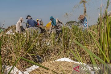 Petani memanen padi di Bandung, Pandeglang, Banten, Rabu (9/8/2023). Sejumlah petani di daerah tersebut terpaksa memanen padi lebih awal guna mengantisipasi dampak fenomena El Nino yang mengakibatkan lahan persawahan mengalami kekeringan sehingga menyebabkan gagal panen. ANTARA FOTO/Muhammad Bagus Khoirunas/Spt.