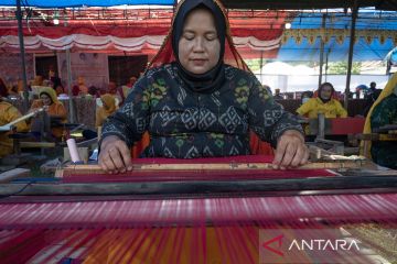 Perajin mengikuti penenunan massal kain sarung Donggala pada pembukaan Festival Tenun Donggala di Desa Towale, Kabupaten Donggala, Sulawesi Tengah, Kamis (10/8/2023). Festival yang digelar kedua kalinya itu selain untuk melestarikan dan mempromosikan kain tenun Donggala sebagai ikon budaya Sulawesi Tengah, juga untuk menguatkan usulan pengakuan dunia melalui UNICEF sebagai bagian dari warisan budaya tak benda. ANTARA FOTO/Basri Marzuki/rwa.