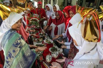 Peserta menunjukkan makanan khas Minang Sumatera Barat saat mengikuti lomba masak cipta menu tradisional di SDN Pekunden, Semarang, Jawa Tengah, Selasa (16/8/2023). Lomba memasak berbagai macam cipta menu tradisional itu digelar bertujuan untuk memperkenalkan keanekaragaman kuliner daerah khas Indonesia agar lebih dikenal masyarakat serta memeriahkan HUT ke-78 Kemerdekaan Republik Indonesia. ANTARA FOTO/Makna Zaezar/rwa.