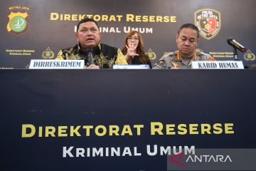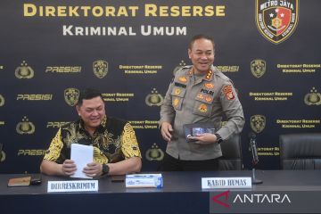 Direktur Reserse Kriminal Umum (Direskrimum) Polda Metro Jaya Kombes Pol Hengki Haryadi (kiri) didampingi Kabid Humas Polda Metro Jaya Kombes Pol Trunoyudo Wisnu Andiko (kanan) memberikan keterangan terkait penangkapan tiga anggota Polri di Jakarta, Jumat (18/8/2023). Hengki menyatakan tiga orang anggota Polri yang diamankan tidak terkait dengan terorisme melainkan dengan tindak pidana jual beli senjata api ilegal. ANTARA FOTO/Akbar Nugroho Gumay/pras.