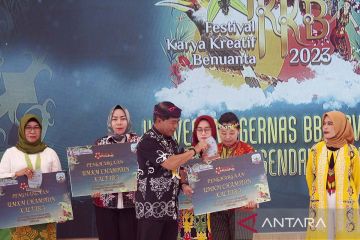 Gubernur Kalimantan Utara Zainal Arifin Paliwang (tengah) secara simbolis memberikan penghargaan kepada peserta UMKM pada acara puncak Gerakan Nasional (Gernas) Bangga Buatan Indonesia (BBI) dan Bangga Berwisata di Indonesia (BBWI) 2023 di Lanud Anang Busra, Tarakan, Kalimantan Utara, Minggu (20/8/2023). Gernas BBI dan BBWI Kaltara 2023 bertema Menyatu Dalam Harmoni Benuanta merupakan bentuk kontribusi nyata dari hasil kolaborasi Bank Indonesia bersama pemerintah provinsi dan kabupaten/kota, pelaku UMKM, serta pemangku kepentingan lainnya untuk mendorong UMKM berdaya saing tinggi dengan mengedepankan inovasi, digitalisasi, serta tetap optimis, kuat, dan tangguh. ANTARA FOTO/Yulius Satria Wijaya/Spt.