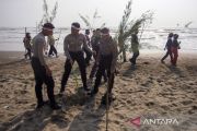 Sejumlah personel Polisi bersama relawan menanam pohon cemara laut di Pantai Tirta ayu, Balongan, Indramayu, Jawa Barat, Rabu (23/8/2023). Kegiatan menanam pohon bertema Polri Peduli Lingkungan itu dilakukan serentak di seluruh Indonesia dan memecahkan rekor MURI penanaman 21 juta pohon secara bersamaan. ANTARA FOTO/Dedhez Anggara/Spt.