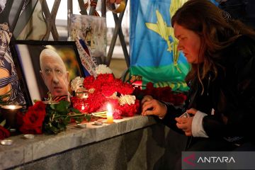 Seorang wanita menyalakan lilin di depan potret komandan tentara bayaran Wagner Yevgeny Prigozhin saat upacara penghormatan dan belasungkawa di Moskow, Rusia, Kamis (24/8/2023). Yevgeny Prigozhin diyakini tewas dalam kecelakaan pesawat pada Rabu malam (23/8). ANTARA FOTO/Reuters/Stringer/nym.