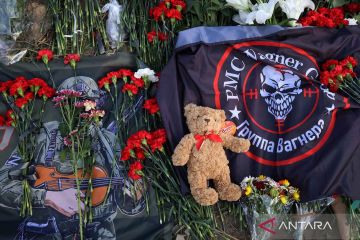Bendera dan boneka teddy bear dipajang dalam upacara penghormatan dan belasungkawa atas tewasnya komandan tentara bayaran Wagner Yevgeny Prigozhin, di depan tugu peringatan di dekat bekas PMC Wagner Center di Saint Petersburg, Rusia, Kamis (24/8/2023). Yevgeny Prigozhin diyakini tewas dalam kecelakaan pesawat pada Rabu malam (23/8). ANTARA FOTO/Reuters/Stringer/nym.