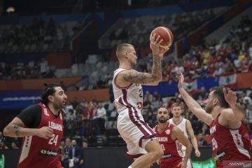 Pebasket Timnas Latvia Aigars Skele (tengah) berusaha melewati hadangan pebasket Timnas Lebanon dalam laga babak fase grup FIBA World Cup 2023 di Indonesia Arena, Gelora Bung Karno, Jakarta, Jumat (25/8/2023). Timnas Latvia mengalahkan Lebanon dengan skor 109 - 70. ANTARA FOTO/Galih Pradipta/hp.