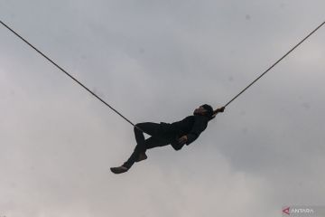 Seorang seniman berakrobat di seutas tali saat pertunjukan kesenian Lais di Cibeber, Lebak, Banten, Senin (28/8/2023). Lais merupakan kesenian akrobatik khas Sunda menggunakan seutas tali sepanjang enam meter yang dikaitkan dengan dua bambu dengan ketinggian 13 meter. ANTARA FOTO/Muhammad Bagus Khoirunas/foc.