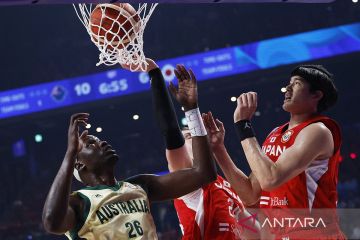 Pebasket Australia Xavier Cooks (kanan) berhasil memasukakan bola sementara pebasket Jepang Koya Kawamata (kiri) dan rekannya Yuta Watanabe gagal membendung serangan pada putaran pertama Grup E FIBA World Cup 2023 di Okinawa Arena, Okinawa, Jepang, Selasa (29/8/2023). ANTARA FOTO/REUTERS/Issei Kato/Spt.