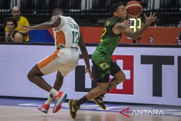 Pebasket Timnas Brasil Yago Santos (kanan) berebut bola dengan pebasket Timnas Pantai Gading Vafessa Fofana (kiri) dalam laga grup G FIBA World Cup 2023 di Indonesia Arena, Gelora Bung Karno, Jakarta, Rabu (30/8/2023). Timnas Brasil mengalahkan Pantai Gading dengan skor 89-77. ANTARA FOTO/Galih Pradipta/tom.
