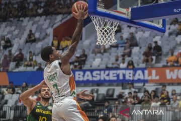 Pebasket Timnas Pantai Gading Maxence Dadiet (kanan) melakukan lay up dalam laga grup G FIBA World Cup 2023 di Indonesia Arena, Gelora Bung Karno, Jakarta, Rabu (30/8/2023). Timnas Brasil mengalahkan Pantai Gading dengan skor 89-77. ANTARA FOTO/Galih Pradipta/tom.
