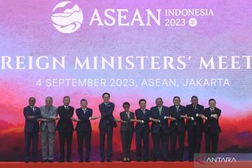 Dari kiri : Menteri Luar Negeri Malaysia Zambry Abd Kadir, Menlu Filipina Enrique A. Manalo, Menlu Singapura Vivian Balakrishnan, Permanent Secretary Thailand Sarun Charoensuwan, Deputy Menlu Vietnam Do Hung Viet, Menteri Luar Negeri RI Retno Marsudi, Menlu Laos Saleumxay Kommasith, Menlu Brunei Darussalam Dato Erywan Pehin Yusof, Menlu Kamboja Sok Chenda Sophea, Menlu Timor Leste Bendito dos Santos Freitas, Sekjen ASEAN Kao Kim Hourn berfoto bersama saat pembukaan Pertemuan Menteri Luar Negeri ASEAN (AMM) di Gedung Sekretariat ASEAN, Jakarta, Senin (4/9/2023). ANTARA FOTO/Media Center KTT ASEAN 2023/Aditya Pradana Putra/tom.