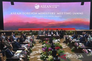 Suasana Pertemuan Menteri Luar Negeri ASEAN (AMM) di Gedung Sekretariat ASEAN, Jakarta, Senin (4/9/2023). ANTARA FOTO/Media Center KTT ASEAN 2023/Aditya Pradana Putra/tom.