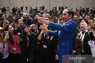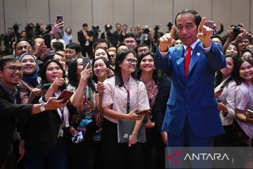 Presiden Joko Widodo melakukan swafoto bersama jurnalis seusai konferensi pers penutupan KTT ke-43 ASEAN di Jakarta, Kamis (7/9/2023). ANTARA FOTO/Media Center KTT ASEAN 2023/Dwi Prasetya/Spt.