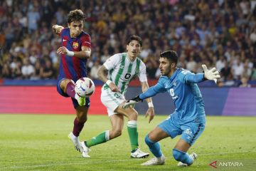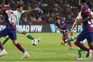 Pesepak bola Barcelona Joao Felix mencetak gol ke gawang Real Betis dalam laga Liga Spanyol di Estadi Olimpic Lluis Companys, Barcelona, Spanyol, Sabtu (16/9/2023). Barca menang telak 5-0 di laga tersebut. ANTARA FOTO/REUTERS/Albert Gea/foc.