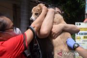 Tenaga kesehatan dari Pusat Kesehatan Hewan (Puskeswan) Suku Dinas Ketahanan Pangan, Kelautan dan Pertanian (KPKP) Kota Administrasi Jakarta Pusat menyuntikkan vaksin rabies ke seekor anjing peliharaan di Kantor Kelurahan Mangga Dua Selatan, Jakarta, Kamis (21/9/2023). Vaksinasi rabies gratis yang dilaksanakan secara berkala itu dalam rangka mempertahankan DKI Jakarta tetap bebas rabies sekaligus menyambut Hari Rabies Sedunia yang diperingati setiap 28 September. ANTARA FOTO/Indrianto Eko Suwarso/Spt..