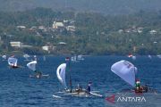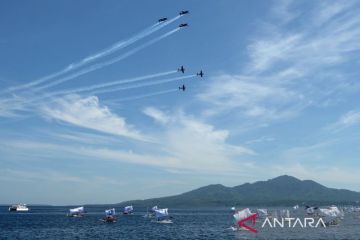 Puluhan perahu layar tradisional berlayar lintas (sail pass) pada pembukaan kompetisi olahraga air di pesisir perairan teluk Manado, Sulawesi Utara, Jumat (22/9/2023). Kegiatan yang diikuti peserta dari TNI, Polri, dan masyarakat umum itu mempertandingkan berbagai cabang olahraga seperti selam, renang, layar, dayung, ski air, dan jetski yang mempererbutkan piala Kepala Staff Angkatan Laut dengan tujuan untuk memasyaratkan olahraga air serta menanamkan identitas sebagai bangsa maritim. ANTARA FOTO/Adwit B Pramono/tom.