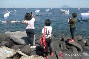 Tiga perempuan memotret perahu layar tradisional yang berlayar lintas (sail pass) pada pembukaan kompetisi olahraga air di pesisir perairan teluk Manado, Sulawesi Utara, Jumat (22/9/2023). Kegiatan yang diikuti peserta dari TNI, Polri, dan masyarakat umum itu mempertandingkan berbagai cabang olahraga seperti selam, renang, layar, dayung, ski air, dan jetski yang mempererbutkan piala Kepala Staff Angkatan Laut dengan tujuan untuk memasyaratkan olahraga air serta menanamkan identitas sebagai bangsa maritim. ANTARA FOTO/Adwit B Pramono/tom.