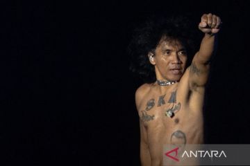 Aksi vokalis grup musik Slank Kaka saat tampil dalam Jogjarockarta Internasional Musik Festival 2023 di Stadion Kridosono, Yogyakarta, Sabtu (30/9/2023). Slank membawakan sejumlah lagu antara lain Virus, I Miss U But I Hate U, Maaf, dan Mars Slank. ANTARA FOTO/Andreas Fitri Atmoko/Spt.