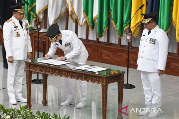Mendagri Tito Karnavian (kiri) menyaksikan penandatanganan pakta integritas oleh Penjabat Gubernur Sumatera Selatan Agus Fatoni (tengah) dan Penjabat Gubernur Kalimantan Timur Akmal Malik (kanan) pada upacara pelantikan di Kantor Kemendagri, Jakarta, Senin (2/10/2023). Agus menggantikan Gubernur Sumsel Herman Deru dan Akmal menggantikan Gubernur Kaltim Isran Noor untuk setahun mendatang. ANTARA FOTO/Aditya Pradana Putra/Spt.