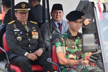 Presiden ke-6 Susilo Bambang Yudhoyono (kiri) bersama Menhan Prabowo menghadiri upacara HUT ke-78 TNI di Lapangan Silang Monumen Nasional (Monas), Gambir, Jakarta, Kamis (5/10/2023). HUT ke-78 TNI mengangkat tema TNI Patriot NKRI: Pengawal Demokrasi untuk Indonesia Maju. ANTARA FOTO/Akbar Nugroho Gumay/aww.