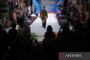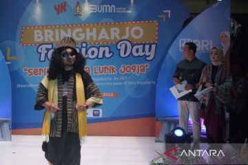 Peserta memperagakan busana kain lurik dalam Bringharjo Fashion Day bertajuk Seribu Makna Lurik Jogja di Pasar Beringharjo, Yogyakarta, Kamis (5/10/2023). Peragaan busana lurik yang diikuti pedagang, buruh gendong dan komunitas pasar di Kota Yogyakarta itu menjadi media pengenalan fesyen kain lurik serta untuk memyambut HUT ke-267 Kota Yogyakarta. ANTARA FOTO/Andreas Fitri Atmoko/aww.