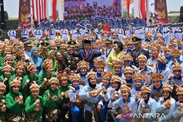 Presiden Joko Widodo (tengah) berfoto bersama penampil saat upacara HUT ke-78 TNI di Lapangan Silang Monumen Nasional (Monas), Gambir, Jakarta, Kamis (5/10/2023). HUT ke-78 TNI mengangkat tema TNI Patriot NKRI: Pengawal Demokrasi untuk Indonesia Maju. ANTARA FOTO/Akbar Nugroho Gumay/aww.