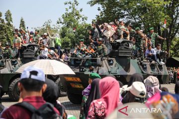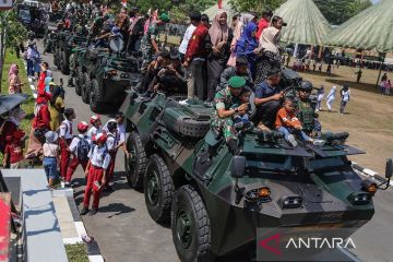 Prajurit TNI bersama warga menaiki panser Anoa saat mengikuti parade alutsista pada peringatan HUT ke-78 TNI di Lapangan Kodam IV/Diponegoro, Semarang, Jawa Tengah, Kamis (5/10/2023). HUT ke-78 TNI mengangkat tema TNI Patriot NKRI: Pengawal Demokrasi untuk Indonesia Maju. ANTARA FOTO/Makna Zaezar/aww.