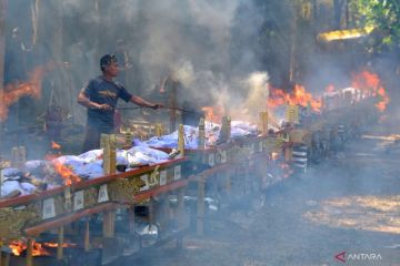 Sejumlah umat Hindu melaksanakan rangkaian upacara Ngaben secara massal di kawasan Legian, Badung, Bali, Kamis (5/10/2023). Sebanyak 111 jasad dikremasi secara bersamaan dalam ritual Ngaben massal yang diselenggarakan lima tahun sekali di wilayah tersebut. ANTARA FOTO/Fikri Yusuf/foc.